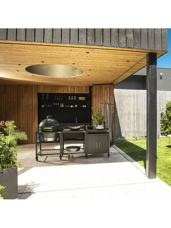 Construisez votre cuisine extérieure étape par étape avec le NOUVEAU système d’emboitement Big Green Egg ! Commencez avec une table modulaire, ajoutez une extension, étagères ou placard ! La table en acier et aluminium thermolaqué est équipée d’une une étagère grillagée en acier inoxydable, des crochets de suspension pour vos accessoires et 4 pieds ajustables en hauteur.