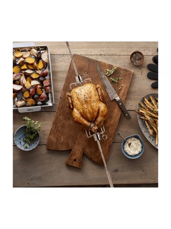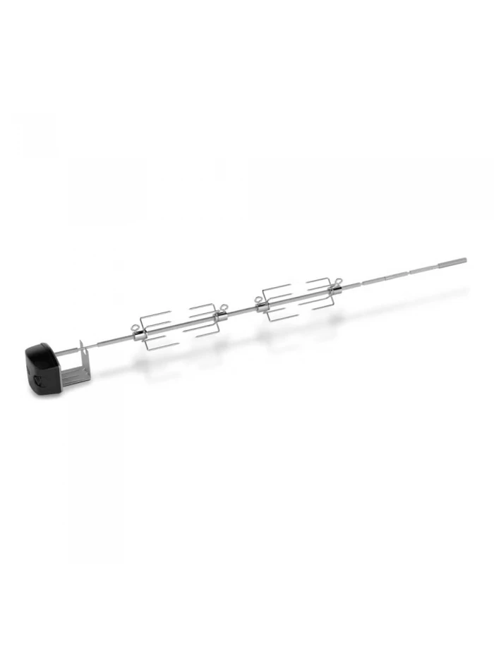 Conçue pour s’adapter à la cuve des barbecues à gaz des séries Genesis® II, Genesis® II LX 400 et 600, la rôtissoire Weber comprend un axe en acier inoxydable de 117 cm, deux fourches permettant d’accueillir des aliments de grosses tailles, les accessoires nécessaires et un moteur électrique qui fait tourner lentement les aliments au-dessus des grilles de cuisson.