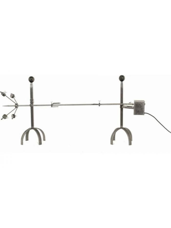 Équipé d’une broche L110 cm, un moteur électrique force 25 kg (2t/min), deux lardoires pour piquer la pièce de viande, quatre masselottes pour contrebalancer le déséquilibre éventuel de la pièce à rôtir et deux piétements à poser au sol ou sur un support réfractaire. S’utilise pour une cuisson de votre pièce de viande au feu de bois ou au charbon de bois. À positionner devant votre feu de cheminée ou en plein air.